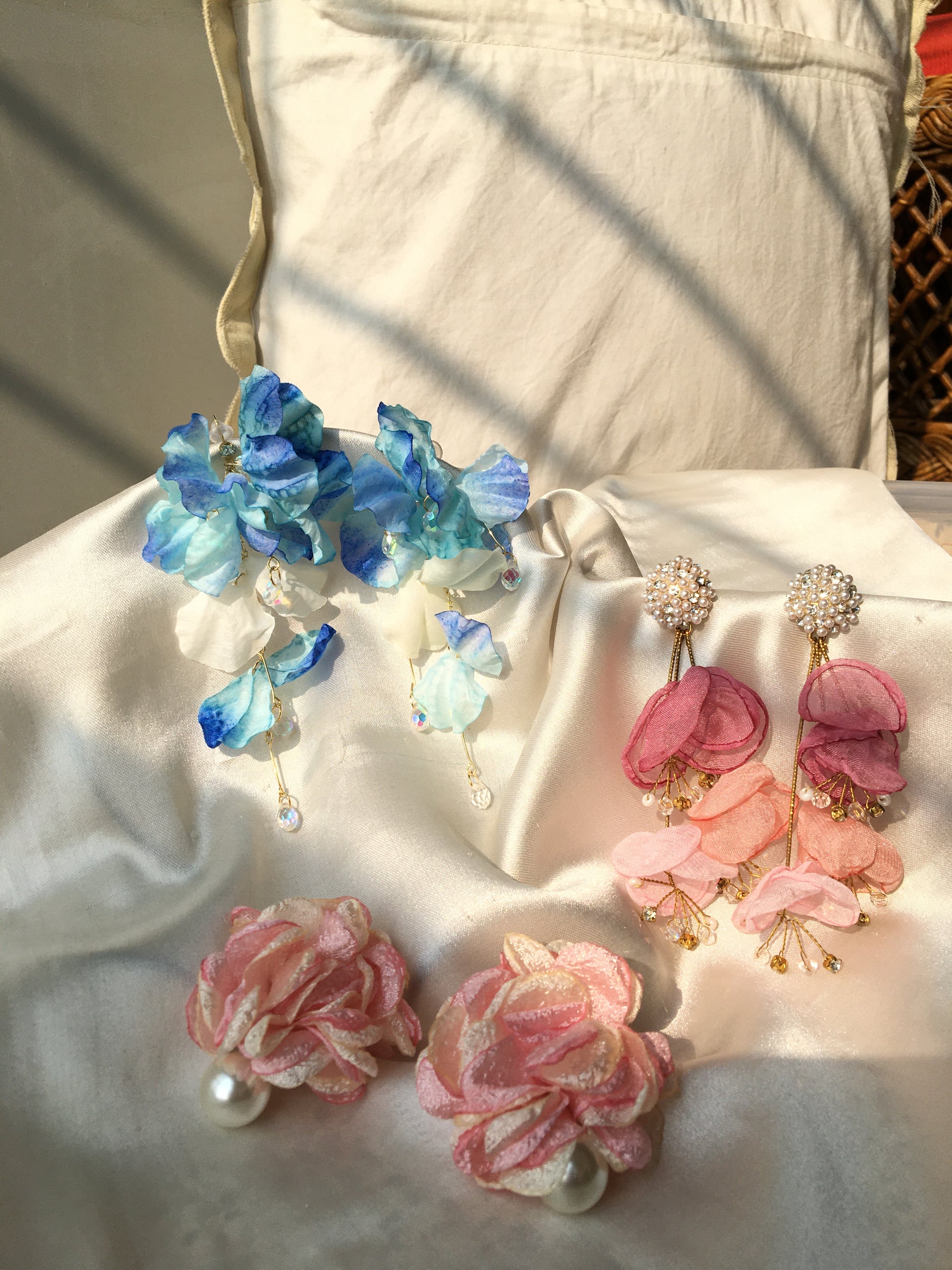 design with multiple pink, floral elements, and a beaded or pearl-like top stud.
