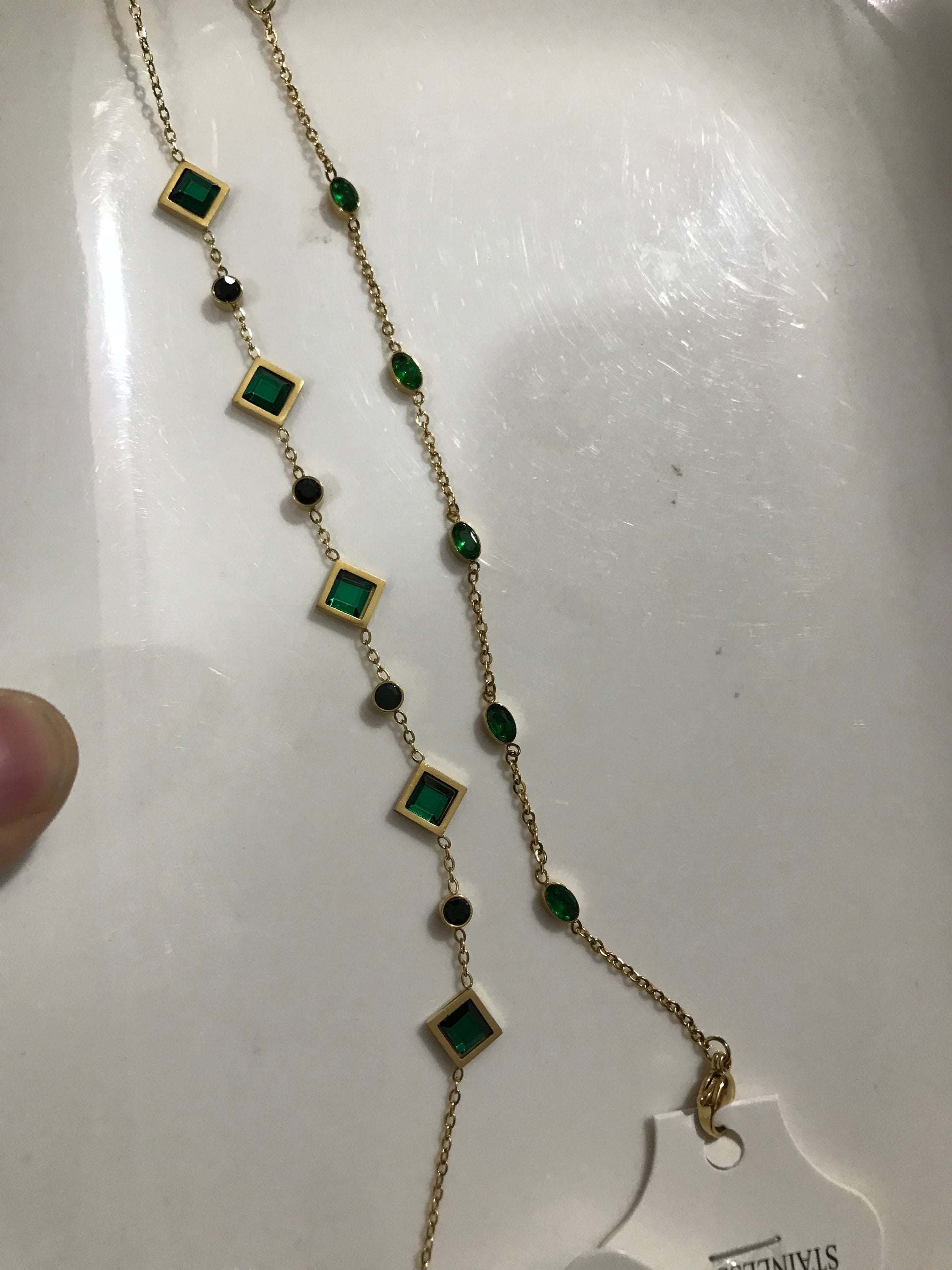 Green stone adjustable stainless steel material. Water and sweat resistant.